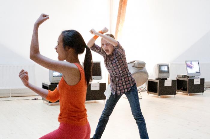 Aurélia et Manon se rencontrent en octobre 2020 au Projet H107 où Aurélia est en résidence artistique. Un dialogue entre les deux artistes s'approfondit au fil des échanges. Pour cet entretien, en juin 2021, Aurélia consulte le fonds d'archives de Manon et extrait certains documents issus des boites de la série ADMH et de celles de la Cie Virevolte. Elle réalise une installation éphémère au Studio du Projet H107, dans laquelle elle invite Manon. Les documents sont des supports au dialogue. Cette première conversation enregistrée fait l'objet d'une transcription à partir de laquelle est pensée la réécriture à deux plumes pour cet entretien édité dans le numéro 11 "Danse et éducation" de la revue Recherches en danse.